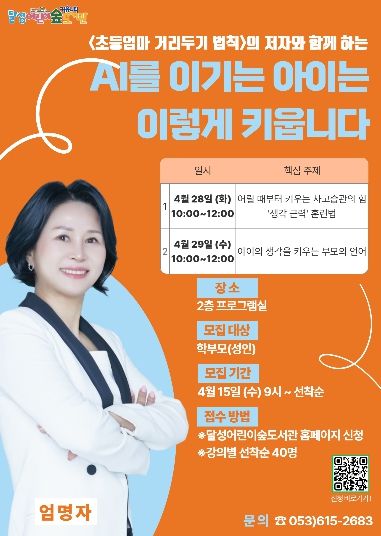 [경남도민뉴스=백상현 기자] 대구 달성군 달성어린이숲도서관이 지역 학부모를 대상으로 한 부모교육 특강 ‘AI를 이기는 아이는 이렇게 키웁니다’의 수강생을 모집한다.