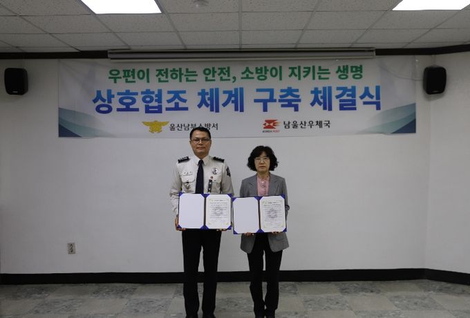 [경남도민뉴스=최재경 기자] 울산 남부소방서는 4월 15일 오전 10시 남부소방서 3층 소회의실에서 남울산우체국과 ‘지역 안전문화 확산을 위한 상호협조 체계 구축’ 협약을 체결한다고 밝혔다.