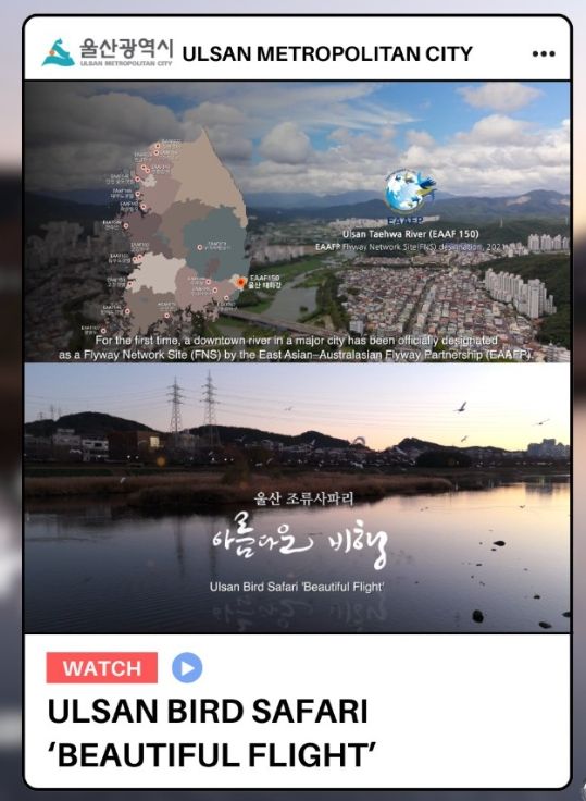 이에 철새이동경로파트너십(EAAFP)은 지난 4월 13일부터 ‘울산 조류사파리’ 홍보영상 영어 자막판(버전)을 페이스북, 인스타그램, 엑스(X, 구 트위터), 링크드인 등 국제기구 공식 관계망(채널)에 게시하고 있다.