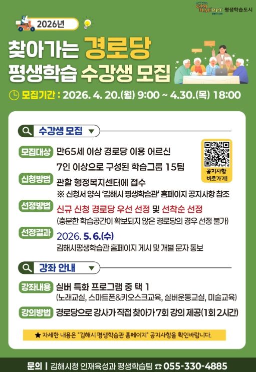 [경남도민뉴스=최미정 기자] 김해시는 평생학습 사각지대 해소와 어르신의 활기찬 노후 지원을 위해 오는 5월부터 ‘2026년 찾아가는 경로당 평생학습 프로그램’을 운영한다고 17일 밝혔다.