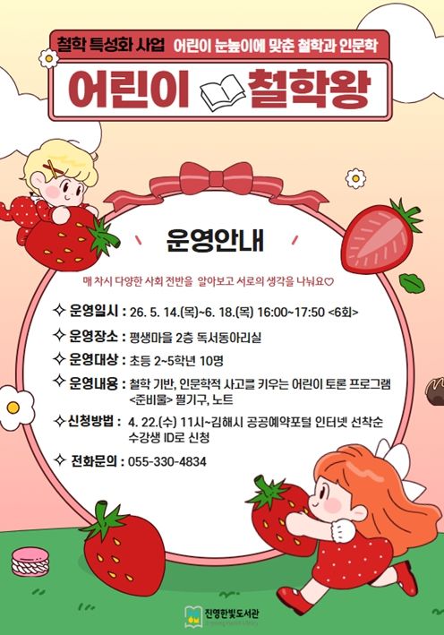 [경남도민뉴스=최미정 기자] 김해시 진영한빛도서관은 오는 5월부터 어린이의 사고력과 표현력 증진을 위한 철학 특성화 프로그램 ‘어린이 철학왕’을 운영한다고 17일 밝혔다.