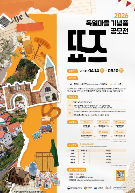 [경남도민뉴스=김부경 기자] 남해군관광문화재단이 ‘2026 독일마을 기념품 공모전, 뚀즈’를 개최하기로 하고, 4월 14일부터 5월 10일 18시까지 참가 접수를 진행한다고 밝혔다.