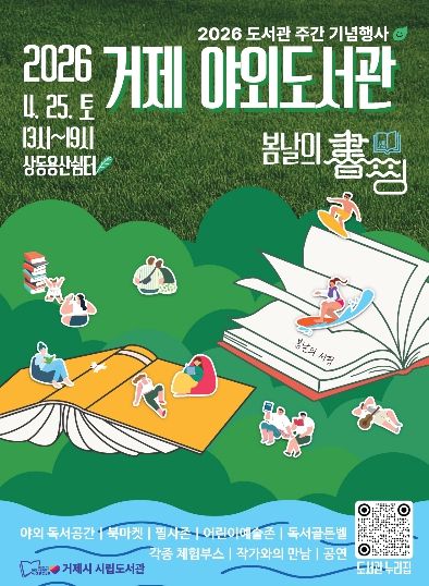 [경남도민뉴스=김부경 기자] 거제시 시립도서관은 4월 도서관 주간을 맞아 오는 4월 25일 상동동 용산쉼터에서 시민 참여형 야외 독서문화 행사인 2026 거제 야외도서관 『봄날의 書(서)핑』을 개최한다.