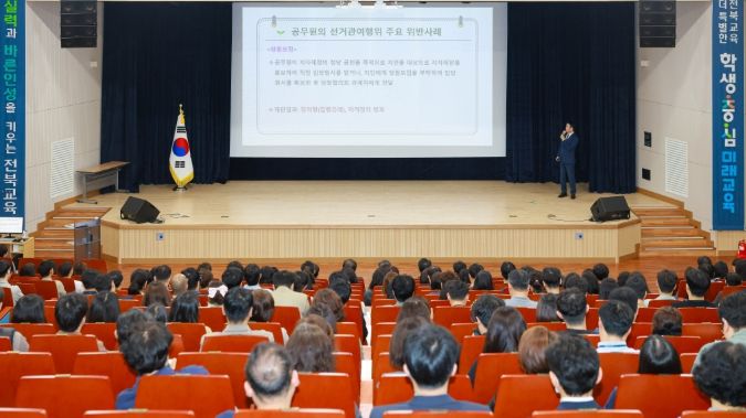 [경남도민뉴스=최인태 기자] 전북특별자치도교육청은 6월 3일 치러지는 전국동시지방선거를 앞두고 공무원의 정치적 중립 의무에 대한 이해를 높이고 선거 관련 위법행위를 사전에 예방하기 위해 17일 창조나래 시청각실에서 전 직원 대상 직장교육을 실시했다.