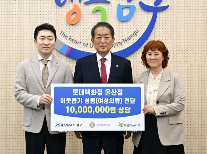 [경남도민뉴스=최재경 기자] 롯데백화점 울산점은 17일 남구청을 방문해 관내 취약계층 지원을 위한 1,000만 원 상당의 의류 60여 벌을 전달했다.