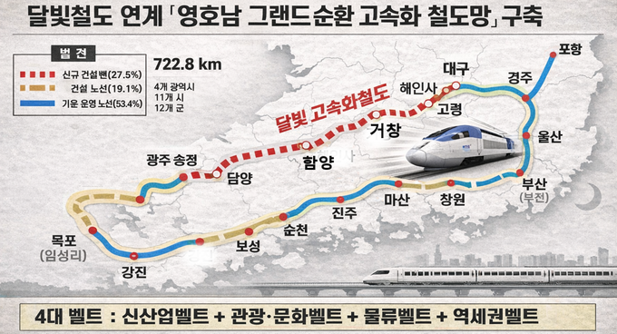 [경남도민뉴스=백형찬 기자] 영남과 호남을 하나로 묶겠다는 ‘달빛내륙철도’가 남부권 교통지도를 근본적으로 바꿀 사업으로 주목받고 있다. 광주와 대구를 동서로 관통하는 이 노선은 단순한 도시 간 연결을 넘어 “영남과 호남을 하나로 묶는 ‘달빛철도’ 이야기”로 상징되는 남부권 초광역 경제권 구축의 핵심 인프라로 평가된다.
