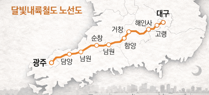 달빛철도는 광주송정역에서 서대구역까지 약 198.8km 구간을 잇는 동서 횡단 철도다. 노선은 대구, 경북, 경남, 전북, 전남, 광주 등 6개 광역 지자체를 관통하며, “그동안 소외됐던 내륙 교통망을 획기적으로 개선하는 핵심 인프라”로 설계됐다. 사업의 1차 목표는 “과거 도로망에만 의존했던 영호남 교류를 철도 중심으로 재편하여 양 지역을 1시간대 생활권으로 묶는 것”이다. 이는 곧 수도권 집중 완화와 남부권 경제 공동체 형성이라는 국가 균형발전 전략과 직결된다.