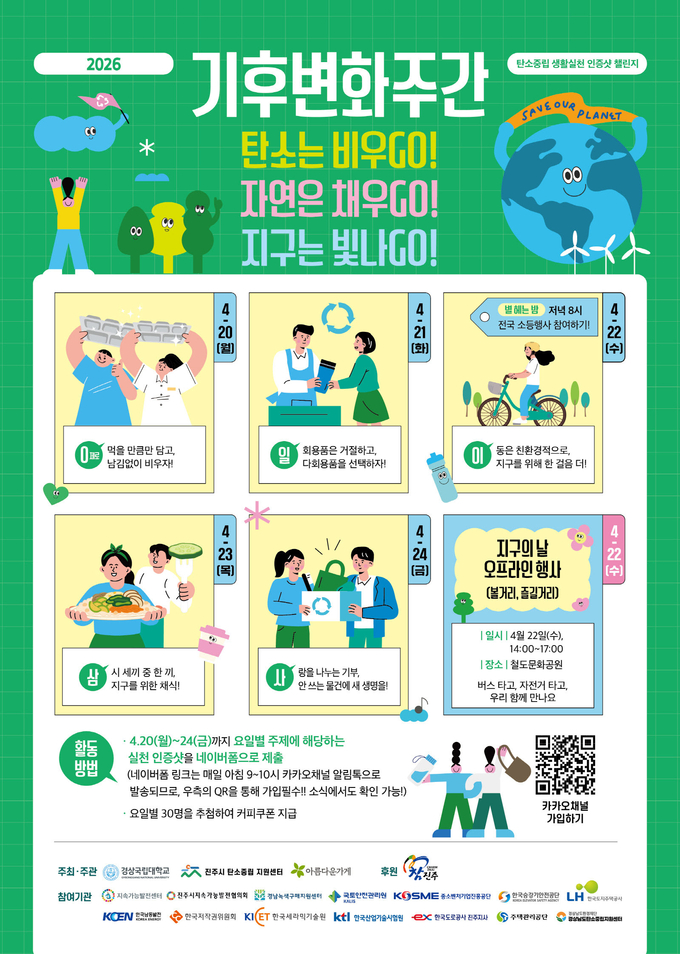 또한 ‘기후 동행 탄소중립 생활 실천 챌린지’는 20일부터 24일까지 카카오톡 채널을 이용한 온라인 실천 인증 캠페인으로 운영한다. 요일별로 다른 실천 주체를 정해 참여자들이 인증 숏을 공유하고, 추첨으로 모바일 쿠폰을 제공한다. 실천 주제는 ▲잔반 제로(Zero) ▲다회용품 사용 ▲친환경 이동 ▲소등 행사 참여 ▲채식 ▲물품 기부 등이다.