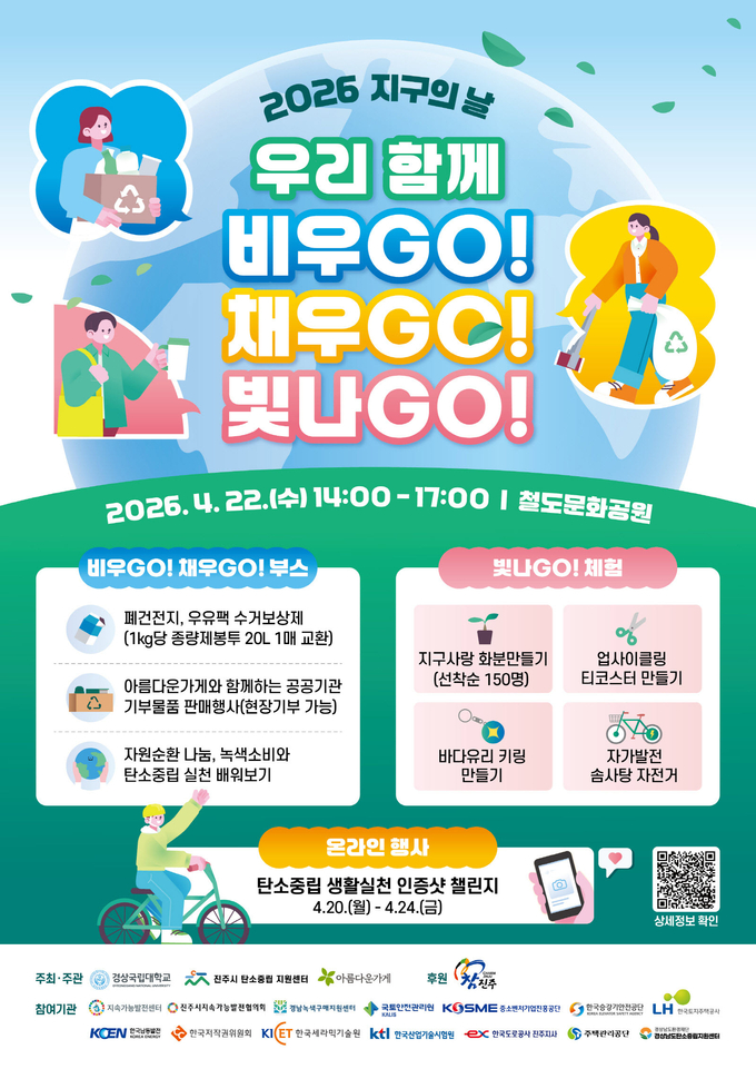 ‘지구의 날 체험 행사’는 22일 오후 2시부터 5시까지 철도문화공원에서 시민 누구나 함께 기후 행동을 실천할 수 있는 행사로 열린다. 이번 행사는 시민이 직접 참여할 수 있는 ▲자가발전 솜사탕 자전거 ▲시민 정원사와 화분 만들기 ▲바다 유리 키링 만들기 ▲업사이클링 티코스터 만들기 등의 다양한 체험관을 비롯해 지구의 날 홍보관과 관내 공공기관이 참여하는 홍보관이 함께 운영된다.