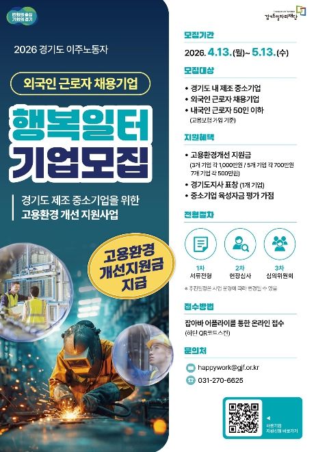 [경남도민뉴스=김동규 기자] 경기도와 경기도일자리재단은 도내 외국인 근로자를 고용한 중소 제조기업을 대상으로 ‘2026년 경기도 이주노동자 행복일터 선정사업’ 참여기업을 모집한다고 20일 밝혔다.