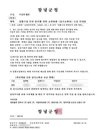 [경남도민뉴스=김병현 기자] 창녕군은 공무원을 사칭해 관내 장례식장에 소방용품(질식소화포) 구매를 요구하는 보이스피싱 사례가 발생했다고 밝혔다.