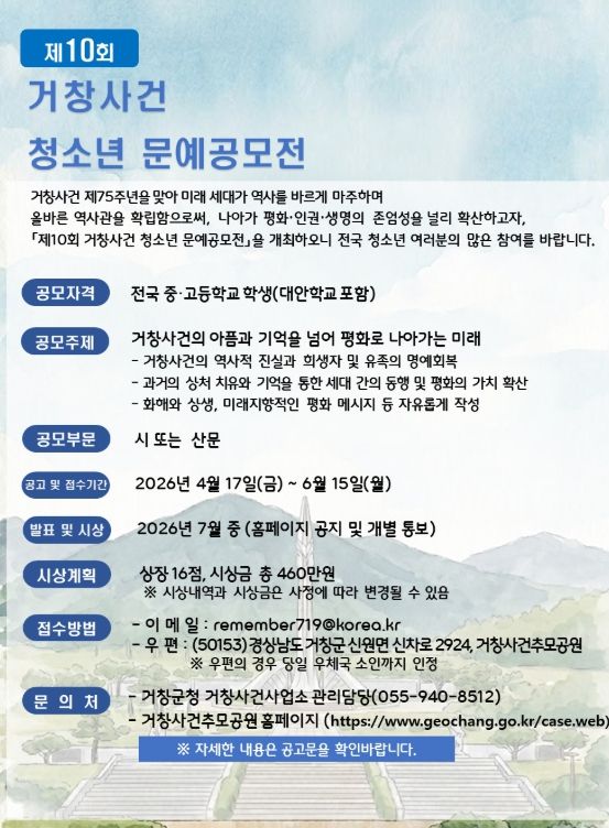 올해는 ‘거창사건의 아픔과 기억을 넘어 평화로 나아가는 미래’를 주제로 전국의 중·고등학생(대안학교 포함)은 누구나 시와 산문 부문에 응모할 수 있으며 시상금은 총 460만 원이다.