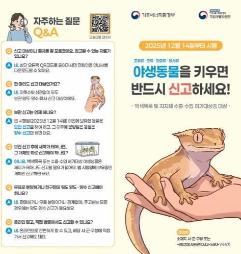 이번 제도는 야생동물 관리 체계를 강화하기 위한 것으로, 2025년 12월 14일부터 2026년 12월 13일까지 1년 동안 계도기간을 운영할 계획이다.