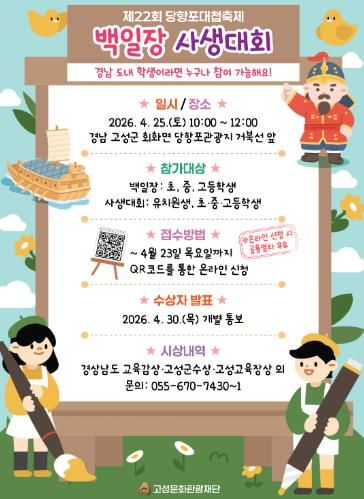 [경남도민뉴스=김태수 기자] 고성문화관광재단은 '제22회 당항포대첩축제' 기간 중 청소년과 가족이 함께 참여할 수 있는 체험형 역사교육 프로그램으로, 4월 25일 오전 10시 ‘경남학생 백일장·사생대회’와 오후 1시 ‘최태성과 함께하는 당항포대첩 – 두 번째 이야기’를 운영한다.