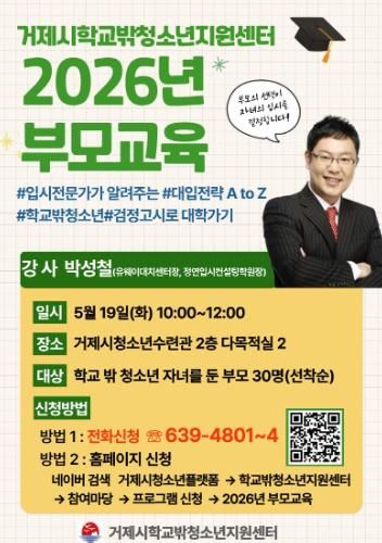 [경남도민뉴스=김부경 기자] 거제시학교밖청소년지원센터에서는 5월 19일 학교 밖 청소년 자녀를 둔 부모를 대상으로'2026년 학교 밖 청소년 부모교육'을 실시한다고 밝혔다.