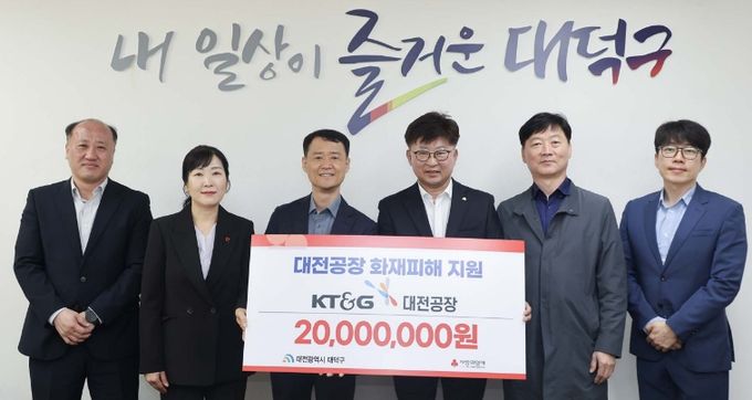 대덕구 관계자는 “어려운 상황에 놓인 우리 지역의 이웃을 위해 큰 나눔을 실천해 주신 KT&G 대전공장에 깊이 감사드린다”며 “소중한 성금이 피해 주민들에게 실질적인 도움이 될 수 있도록 최선을 다하겠다”고 말했다.