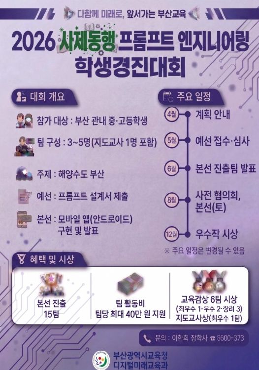 [경남도민뉴스=김채연 기자] 부산광역시교육청은 관내 중·고등학생과 교사가 한 팀으로 참여하는 ‘사제동행 2026 프롬프트 엔지니어링 학생경진대회’를 개최한다고 밝혔다.