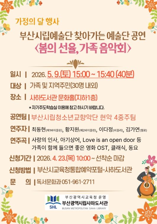 [경남도민뉴스=김채연 기자] 부산광역시립사하도서관은 가정의 달을 맞아 다음달 9일 오후 3시 도서관 문화홀에서 지역주민 30명을 대상으로 부산시립예술단 찾아가는 예술단 공연 ‘봄의 선율, 가족 음악회’를 개최한다.