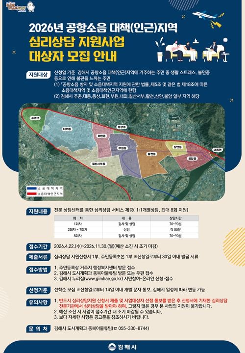 [경남도민뉴스=최미정 기자] 김해시는 공항소음 대책(인근)지역 주민을 대상으로 심리상담 지원사업 참여자를 모집한다고 22일 밝혔다.