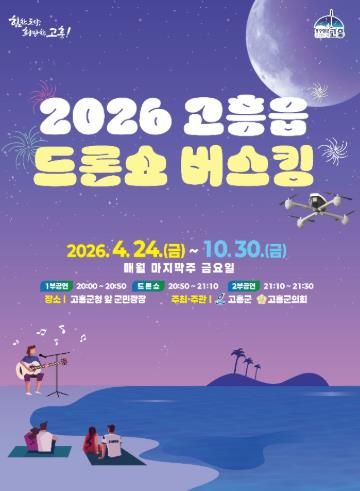 [경남도민뉴스=최인태 기자] 고흥군은 ‘2026 고흥읍 드론쇼 버스킹 공연’을 오는 4월 24일부터 10월 24일까지 7개월간 매월 마지막 주 금요일 고흥군청 앞 군민광장에서 개최한다고 밝혔다.