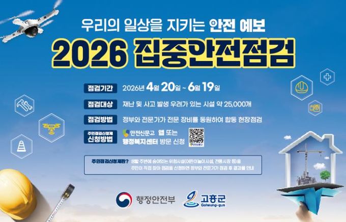 [경남도민뉴스=최인태 기자] 고흥군은 재난과 안전사고 예방을 위해 4월 20일부터 6월 19일까지 2개월간 ‘2026년 집중안전점검’을 실시한다고 밝혔다.