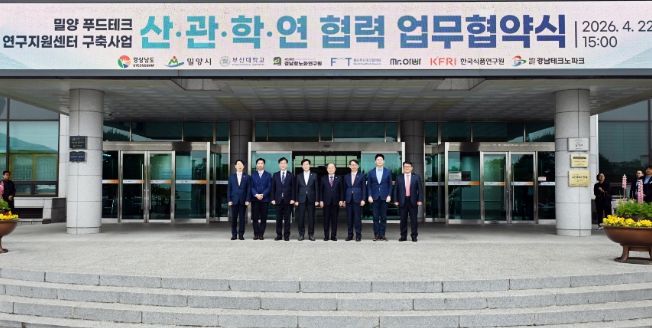 [경남도민뉴스=구인애 기자] 경상남도는 22일 밀양시청에서 ‘밀양 푸드테크 연구지원센터 구축’을 위한 산·관·학·연 협력 업무협약(MOU)을 체결하고, 농림축산식품부가 추진하는 105억 원 규모의 ‘푸드테크 연구지원센터 구축사업(스마트유통 분야)’ 공모 준비에 본격 착수했다.