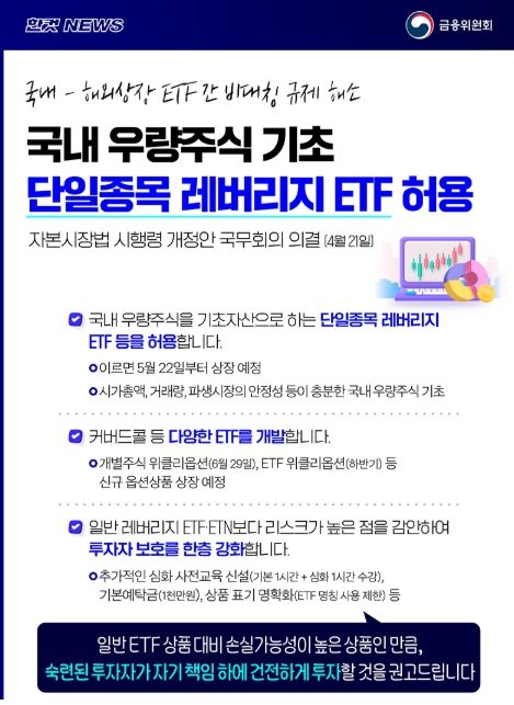 · 국내 우량주식을 기초자산으로 하는 단일종목 레버리지 ETF 등을 허용합니다.