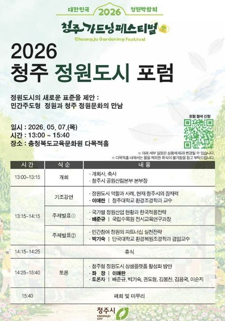 시 관계자는 “이번 포럼이 청주형 정원도시 모델을 정립하는 계기가 되기를 기대한다”며 “정원문화 확산을 통해 시민 삶의 질을 높이고 지속가능한 도시로 발전해 나가겠다”고 밝혔다.