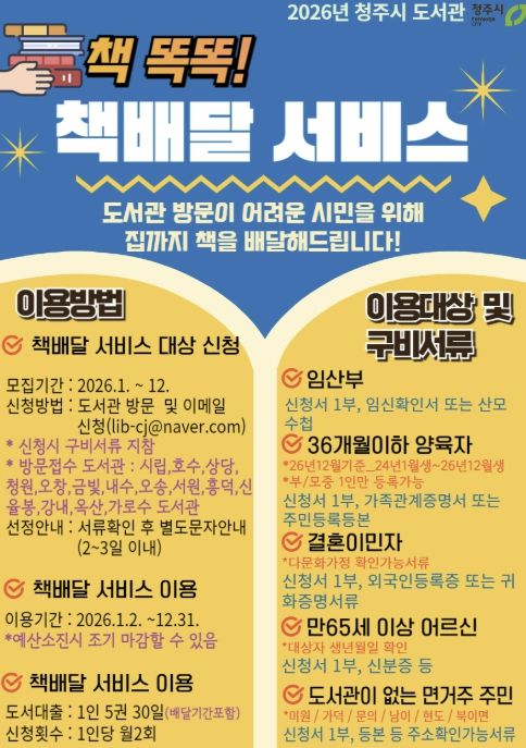 [경남도민뉴스=박만수 기자] 청주시는 도서관 방문이 어려운 독서 취약계층을 위해 운영 중인 ‘책 똑똑! 책배달 서비스’ 신청자가 600명을 돌파했다고 23일 밝혔다.