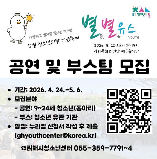 [경남도민뉴스=최미정 기자] 김해시청소년센터는 청소년이 직접 기획하고 참여하는 2026년 청소년의 달 기념 축제 ‘별별유스’를 앞두고 공연 및 체험 부스 참가팀 모집에 나섰다고 밝혔다.