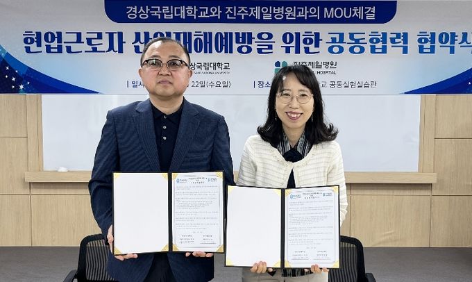 [경남도민뉴스=구인애 기자] 경상국립대학교 안전관리본부와 진주제일병원은 4월 22일 가좌캠퍼스 공동실험실습관 2층 세미나실에서 현업근로자 산업재해 예방을 위한 공동협력 협약을 체결했다.