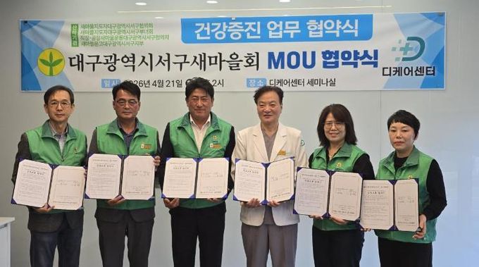 [경남도민뉴스=백상현 기자] 대구광역시서구새마을회는 지난 4월 21일 오후 2시, 디케어센터 세미나실에서 디케어센터와 서구새마을회지도자 및 가족의 건강증진과 복지 향상을 위한 상호협력 업무협약(MOU)을 체결했다.
