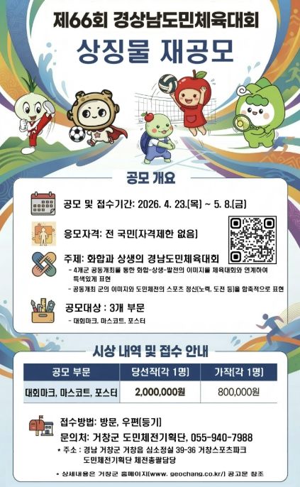 응모자격은 제한 없이 누구나 가능하고 오는 5월 8일까지 접수하며, 세부 사항은 4개군 누리집 및 공고문을 통해 확인할 수 있다. 기타 문의사항은 거창군 도민체전기획단으로 하면 된다. 수상자에게 상금이 수여되고, 수상작은 향후 도민체육대회 공식 홍보물로 활용될 예정이다.