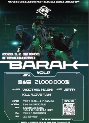 올해로 17회를 맞이하는 ‘발악(BARAK)’은 9세 이상 24세 이하 전국 청소년을 대상으로 하는 올 장르 댄스(K-POP, 스트릿댄스 등) 퍼포먼스 경연대회다.
