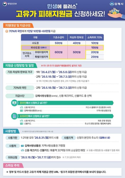 김해시 관계자는“도민 생활지원금도 비슷한 시기에 지급되므로, 지급 대상, 금액 등의 착오로 제때 제대로 지급받지 못하는 경우가 생기지 않도록 홍보와 신청, 접수에 최선을 다하겠다”고 밝혔다,