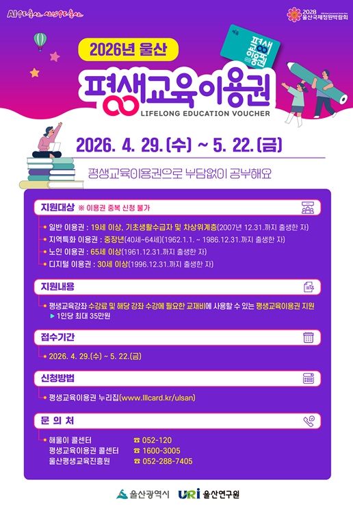 [경남도민뉴스=최재경 기자] 울산시가 경제적 여건에 따른 교육격차를 완화하고, 성인의 자아실현을 지원하기 위해 ‘2026년 평생교육이용권 지원사업’의 2차 신청 접수에 나선다.
