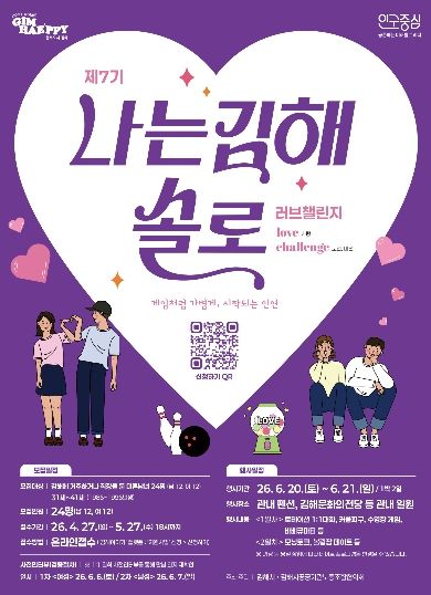 [경남도민뉴스=최미정 기자] 김해시는 오는 6월 20일부터 21일까지 1박 2일 일정으로 관내 펜션과 김해문화의전당 등에서 진행하는‘제7기 나는 김해솔로-러브챌린지’참가자 24명(남·여 각 12명)을 모집한다고 24일 밝혔다.