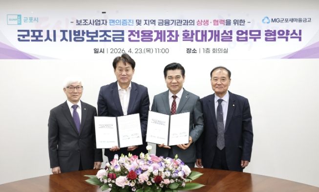 [경남도민뉴스=김동규 기자] 군포시는 지방보조금 전용계좌 개설 금융기관을 기존 시 금고인 NH농협은행에 더해 새마을금고까지 확대하기 위한 업무협약을 23일 체결했다고 밝혔다.
