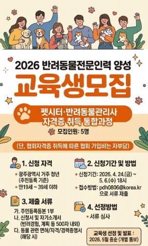 [경남도민뉴스=최현인 기자] 광주광역시는 반려동물 산업 성장에 대응하고 전문역량을 갖춘 인재 양성을 위한 ‘2026년 반려동물 전문인력 양성교육’을 실시한다.