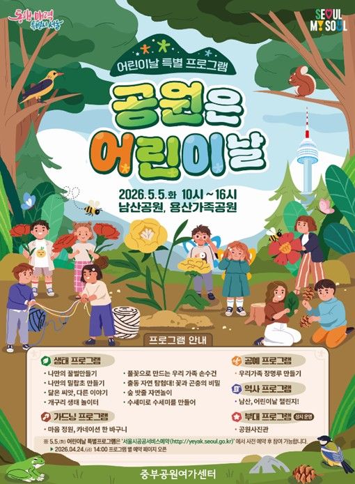 [경남도민뉴스=서용재 기자] 서울시 중부공원여가센터는 5월 5일 어린이날을 맞아 ‘남산하늘숲길’ 개방 이후 산책 명소로 많은 사랑을 받고 있는 남산공원과, 푸르른 잔디가 펼쳐진 용산가족공원에서 온 가족이 함께 즐길 수 있는 특별프로그램 '공원은 어린이날'을 운영한다고 밝혔다.