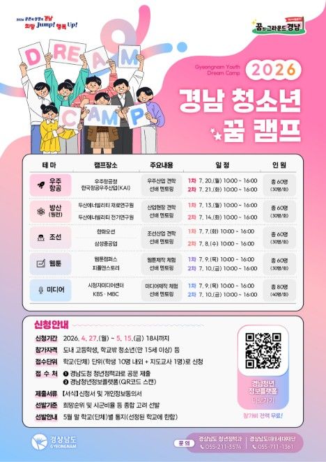 [경남도민뉴스=구인애 기자] 경상남도는 도내 고등학생과 만 15세 이상 학교밖청소년을 대상으로 4월 27일부터 5월 15일까지 2026년 경남 청소년 꿈 캠프 참가자를 모집한다고 밝혔다.