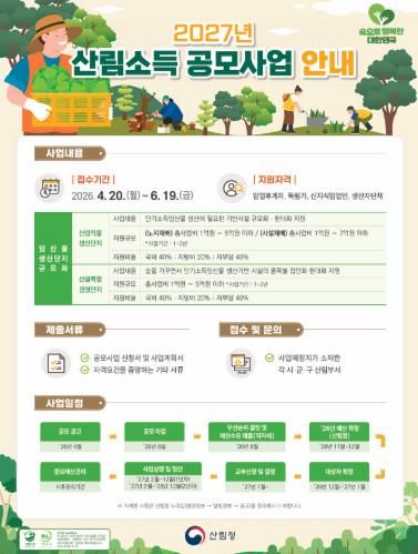 [경남도민뉴스=최인태 기자] 고흥군은 임산물 생산 기반 확충과 임업 경쟁력 강화를 위해 ‘2027년도 산림소득사업(임산물생산단지 규모화)’ 공모사업 신청을 오는 6월 19일까지 접수한다고 밝혔다.