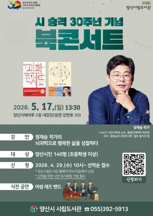 [경남도민뉴스=최미정 기자] 양산시는 시 승격 30주년을 맞아 시민과 함께하는 특별한 문화행사로 북콘서트를 5월 17일(일) 13시 30분에 양산지혜마루 대강당에서 개최한다고 밝혔다.