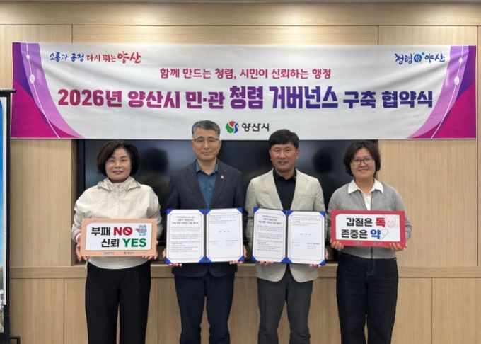[경남도민뉴스=최미정 기자] 양산시 안전도시국이 청렴 시책의 실효성을 높이고 민·관 협력체계를 공고히 하기 위해 양산소방서 의용소방대연합회와 ‘민·관 청렴 거버넌스’ 업무협약을 체결했다고 밝혔다.