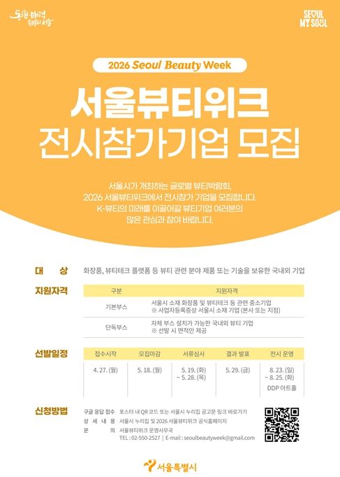 참여를 희망하는 기업은 5월 18일까지 구글 폼을 통해 신청할 수 있으며, 자세한 사항은 서울뷰티위크 공식 누리집 또는 서울시 누리집에서 확인할 수 있다.