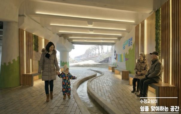 공간별 계획을 보면, 수정교 하부에는 주민 휴게공간과 작품 감상이 가능한 열린 갤러리가 마련되며, 벽놀이 교구 등을 활용한 어린이 놀이공간도 함께 조성된다.