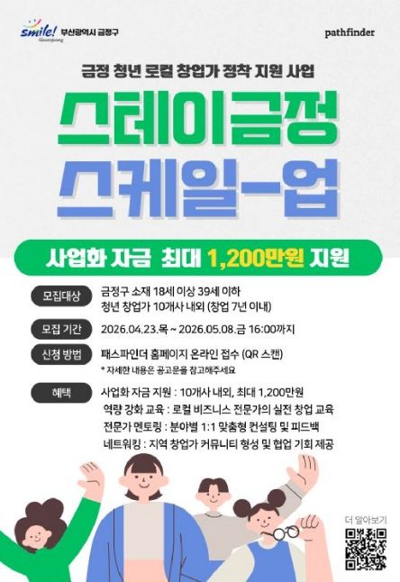 [경남도민뉴스=신석주 기자] 부산 금정구는 청년 창업가의 지역 기반 창업과 로컬 비즈니스 활성화를 위해 ‘2026 금정 청년 로컬 창업가 정착 지원사업(스테이 금정 Scale-up)’ 참여 기업을 모집한다.
