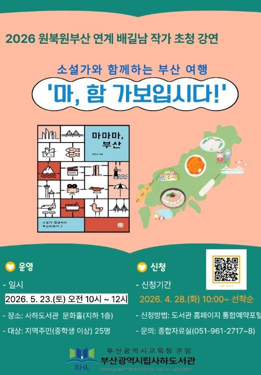 [경남도민뉴스=김채연 기자] 부산광역시립사하도서관은 다음달 23일 오전 10시 사하도서관 문화홀에서 청소년과 성인 25명을 대상으로 2026 원북원부산 연계 배길남 작가 초청 강연 ‘마, 함 가보입시다!’를 개최한다.