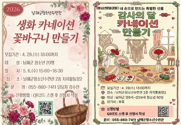 [경남도민뉴스=김부경 기자] 남해군 청소년수련관은 가정의 달 5월과 어버이날을 맞아 청소년 대상 문화체험 프로그램 ‘카네이션 만들기 원데이클래스’를 운영한다고 밝혔다.