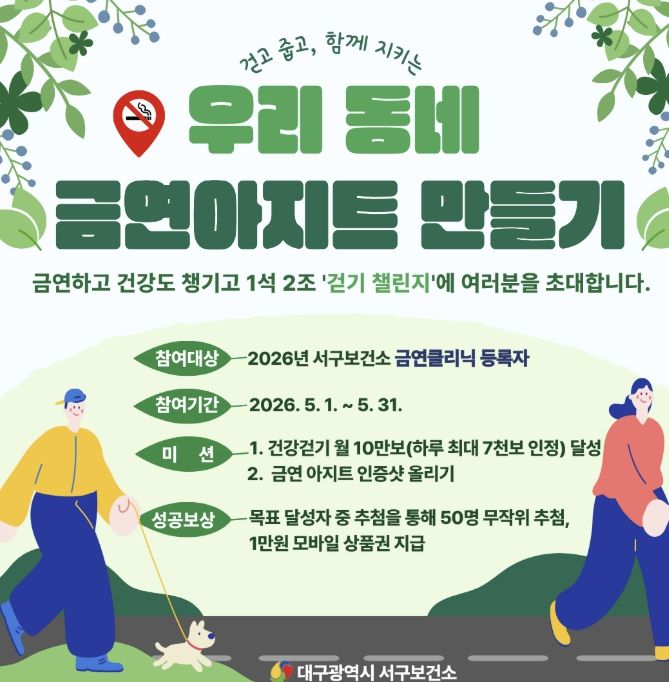 [경남도민뉴스=백상현 기자] 대구 서구보건소는 금연 시도자들이 일상에서 즐겁게 목표를 달성할 수 있도록 금연 실천과 신체 활동을 결합한 ‘우리 동네 금연 아지트 만들기’ 챌린지를 오는 5월부터 10월까지 본격 운영한다고 밝혔다.